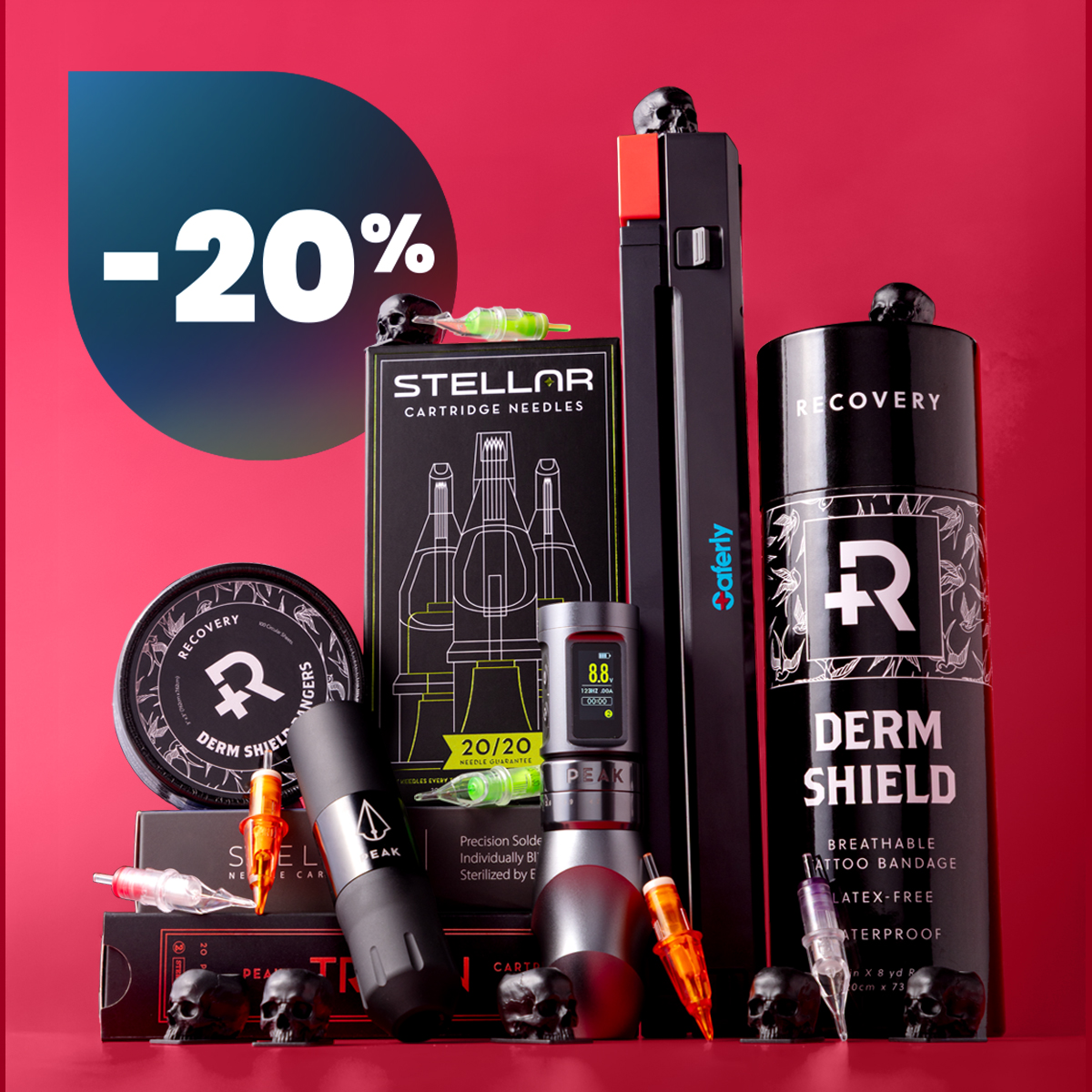 Vi skyder 2026 i gang med fantastiske tilbud! Få 20% rabat på et udvalg af førsteklasses tatoveringsudstyr fra nogle af dine yndlingsmærker, herunder Peak, Saferly, Recovery og Killer Ink!