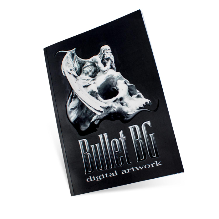 Kig på Bullet BGs bog, med 50 originale digitale illustrationer til tatoveringer. Inkluderer krig, død, ansigter, religion og myter. Se hvordan Bullet BG manipulerer sine billeder til utrolige digitale illustrationer.