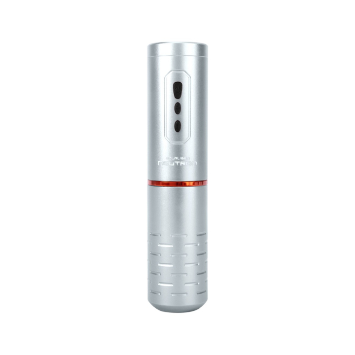 Equalisers trådløse Neutron tatoveringspen har en aluminiumshusning og et tydeligt digital display samt tre knapper til at betjene maskinen. Det digitale display viser strømstyrken (V), batteriniveauet (%) og den tid der er gået siden maskinen blev tændt (nulstilles hver gang du slukker for din Neutron).