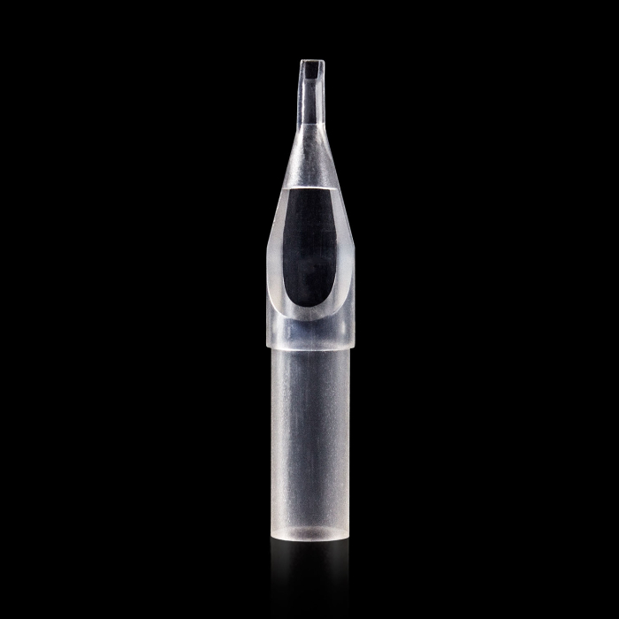 Pakke med 50 Killer Ink PREMIUM Clear engangs Flat Tips. De er individuelt pakket i steril blisterpakning. Tip'en er gennemsigtig, så du kan lettere se nål og blæk.