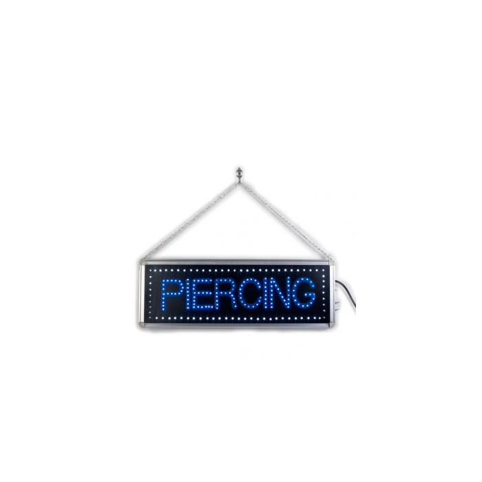 LED skiltet med teksten PIERCING kan hænges i dit studievindue. Leveres komplet med kæde, og kan tilsluttes direkte til en stikkontakt med en ledning der er ca. 1900mm lang. Skiltet leveres med fire forskellige indstillinger:
