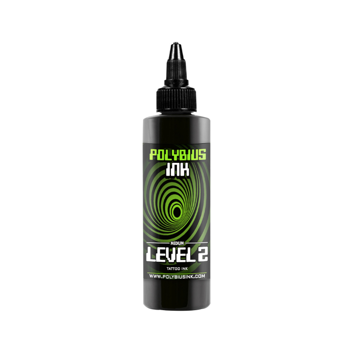 Medium Level 2 fra Polybius Ink er en mellemgrå tatoveringsblæk, der er perfekt til overgangen mellem lyse og mørke områder. Den kan bruges alene eller fortyndet med niveau 0.