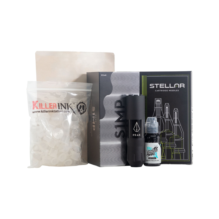 Indeholder en pen-stil tatoveringsmaskine med trådløst batteri, sort blæk og blækkopper, patroner og et stykke øvelseshud, så du kan begynde at øve med det samme. Alt i dette sæt sælges individuelt på Killer Inks hjemmeside, så du kan genopfylde det efter behov.