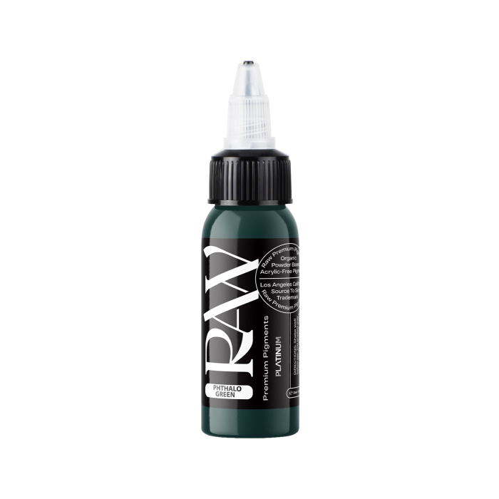 Phthalo Green er en dyb, mørkegrøn tatoveringsblæk fra Raw Premium Pigments' EU REACH-kompatible Platinum-serie.