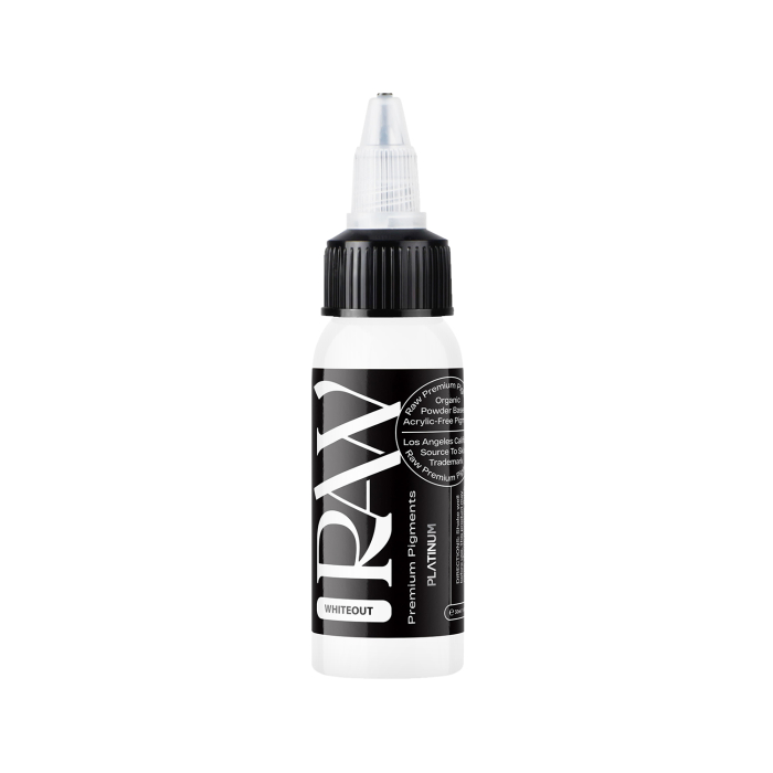 Whiteout fra Raw Premium Pigments er et meget pigmenteret tungt hvidt tatoveringsblæk, der er ideelt til solid mætning og highlights med langtidsholdbare resultater, samt lysnende andre blæk.