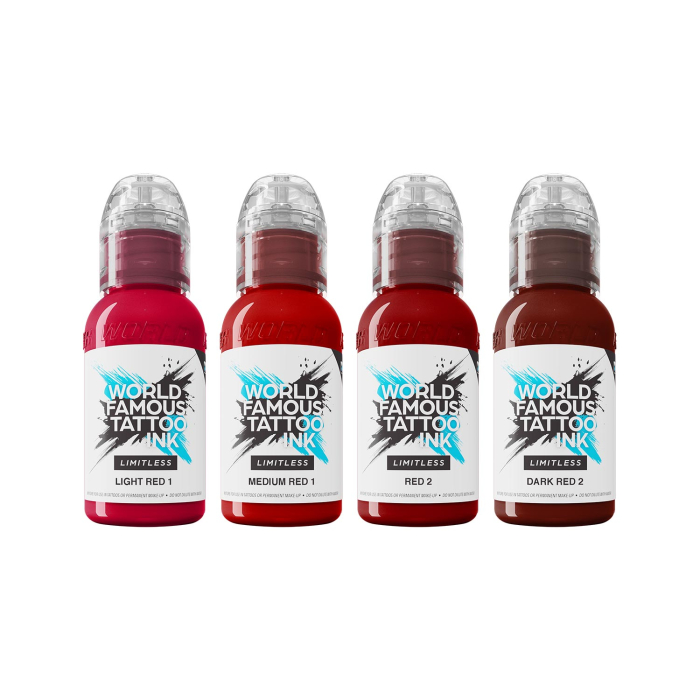 World Famous Limitless Shades of Red-kollektionen er et sæt der består af 4 flasker med en række røde tatoveringsfarver, der alle fuldt ud overholder de opdaterede EU REACH-forordninger, der blev indført i januar 2023.